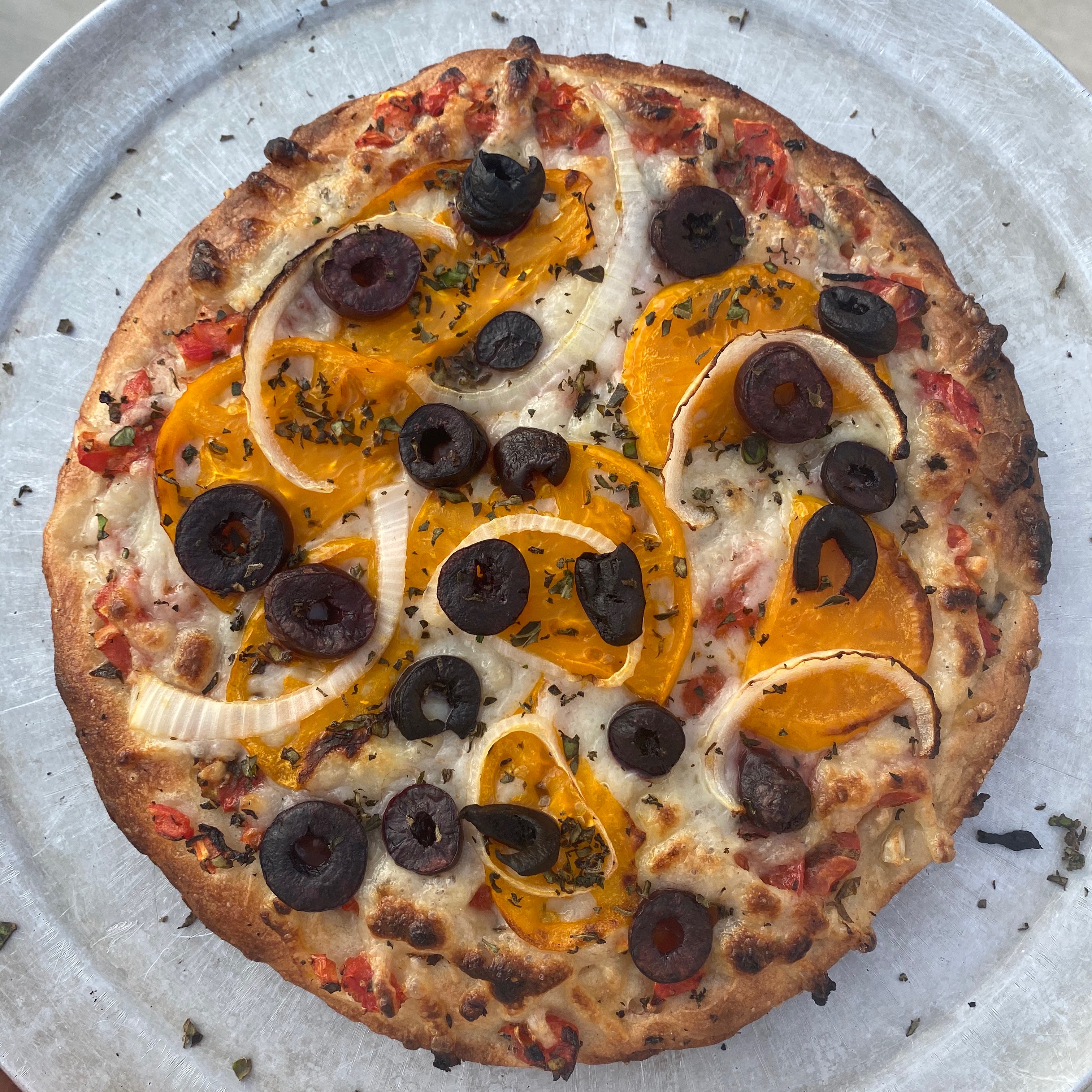 Our fall themed veggie delight pizza has an assortment of sweet bell peppers, cubed zucchini, olives, spinach, mushrooms, onion, garlic and herbs for an earthy compliment. Crispy, doughy, cheesy . . . we recommend our basil drizzle on this!