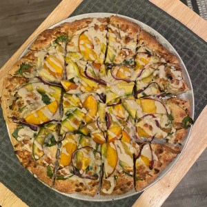 Fresh peaches, fresh avocado, red onion, spinach, mozzarella, tahini drizzle