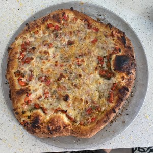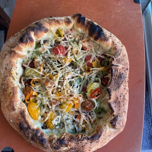 Stuffed crust with heirloom tomatoes, yellow bell peppers, red onion, garlic and mozzarella
