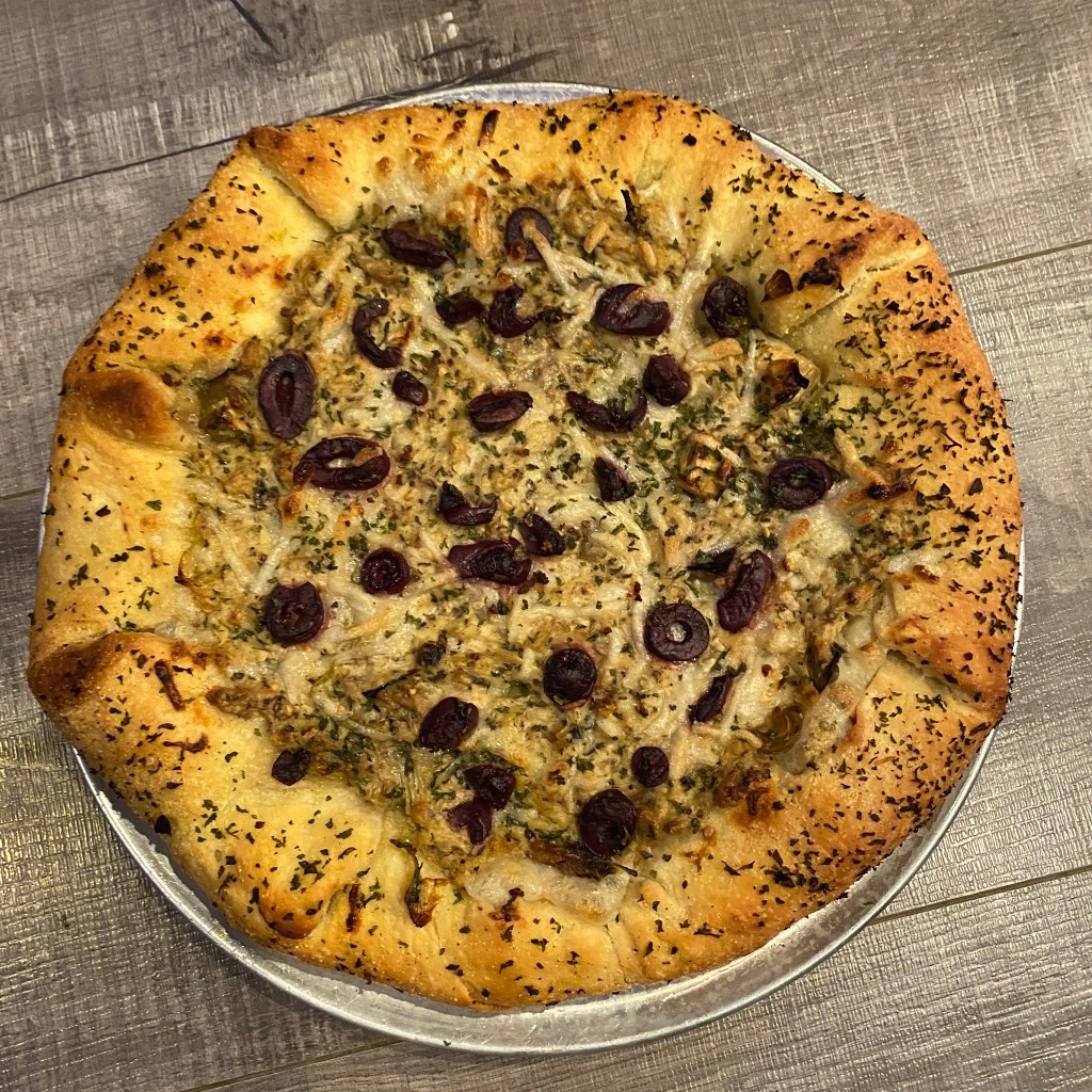White sauce, cauliflower, Kalamata olives, white onion, fresh basil and mozzarella