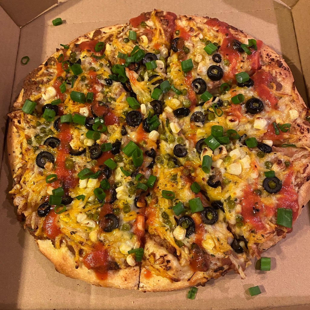 Oregano and garlic, mozzarella, cauliflower, mushrooms, red onions, celery. Hot wing drizzle and green ranch drizzle